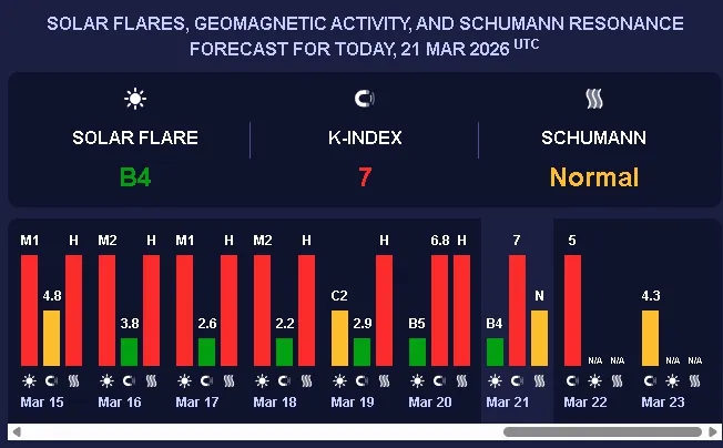 Прогнозований К‑індекс становитиме 5, що відповідає сильній магнітній бурі червоного рівня. Такі коливання можуть впливати на атмосферний тиск, викликаючи головний біль, втому, дратівливість та загальне виснаження у метеочутливих людей.