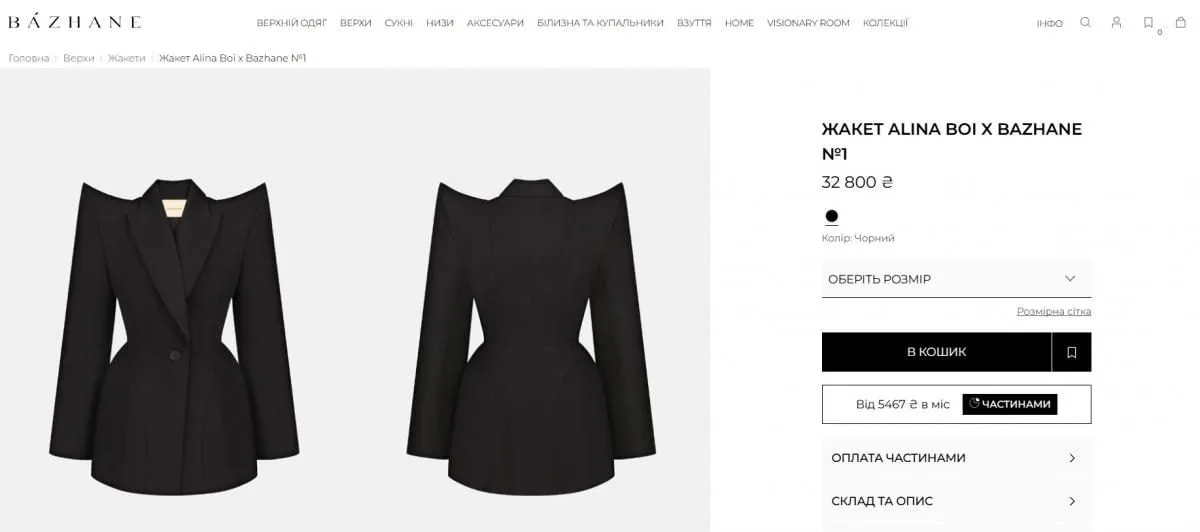 Другий – стриманий і вишуканий: чорний жакет Bazhane за 32 800 гривень і срібна брошка у вигляді ластівок від Sova за 4670 гривень.