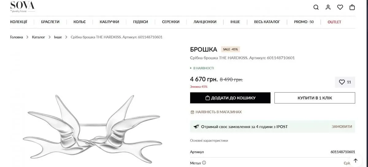 Брошка Софії Ткачук. Скріншот: sovajewels.com
