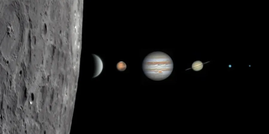 На фінальному зображенні зліва направо видно: Місяць, Венеру, Марс, Юпітер, Сатурн, Уран і Нептун.