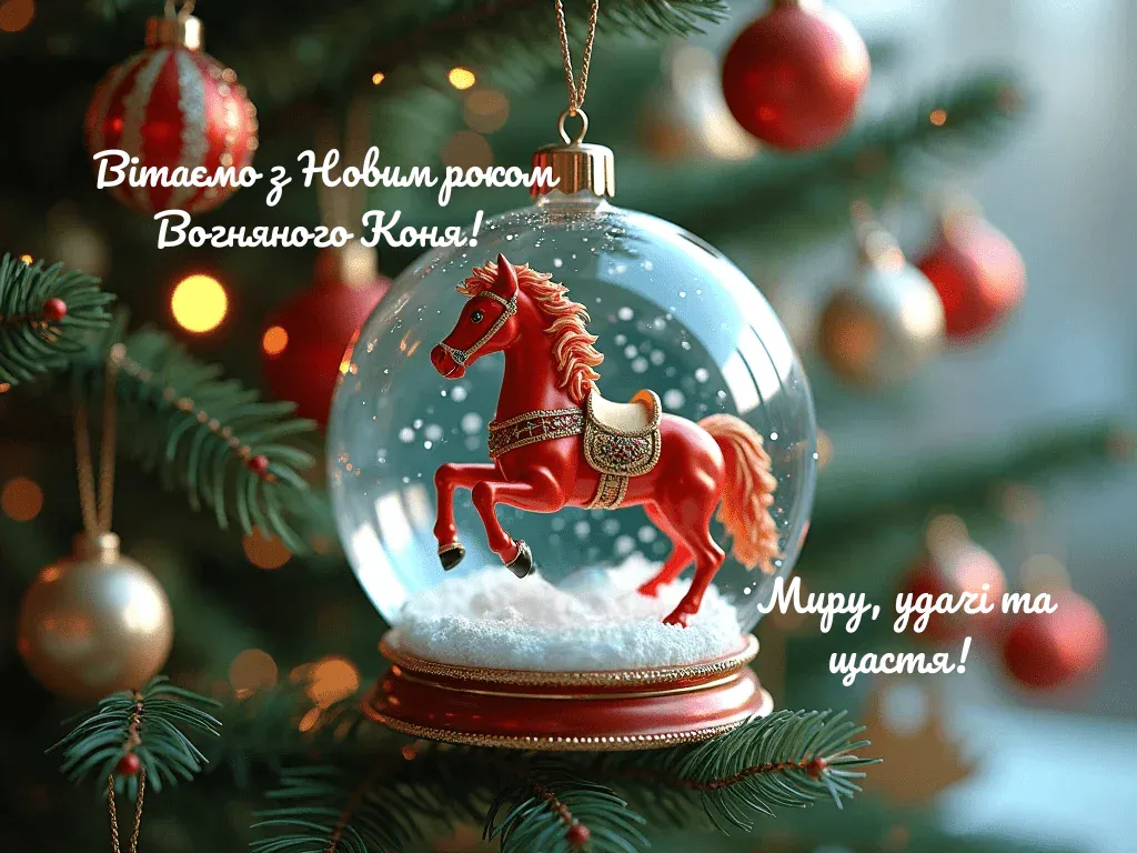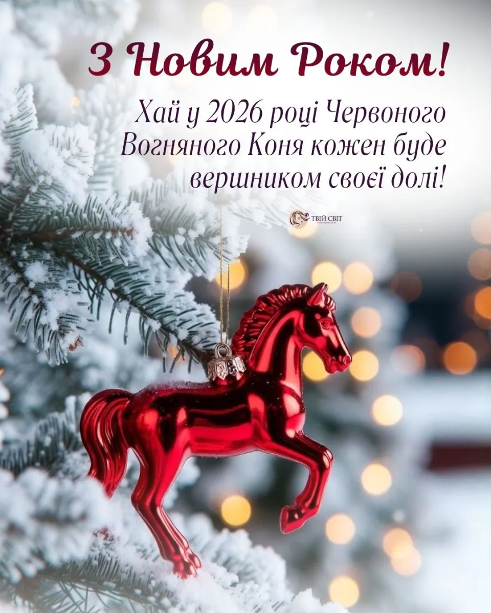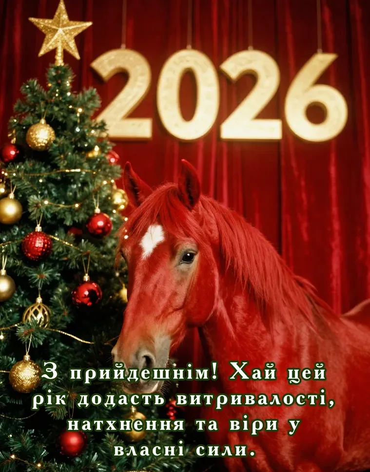 Нехай символ 2026 року — Вогняний Кінь — примчить у ваше життя на крилах успіху та процвітання. Бажаю, щоб вогонь у ваших очах ніколи не згасав, а віра у краще майбутнє лише зміцнювалася. Нехай цей святковий час стане початком дивовижного шляху, сповненого яскравих подій та щирих людей поруч!