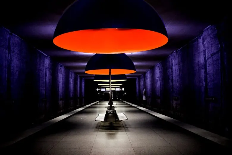 - Westfriedhof (Мюнхен, Німеччина). Станція відома своїм футуристичним освітленням: величезні кольорові світильники створюють атмосферу артпростору. Мінімалістичний дизайн і гра світла роблять її однією з найстильніших станцій Європи.