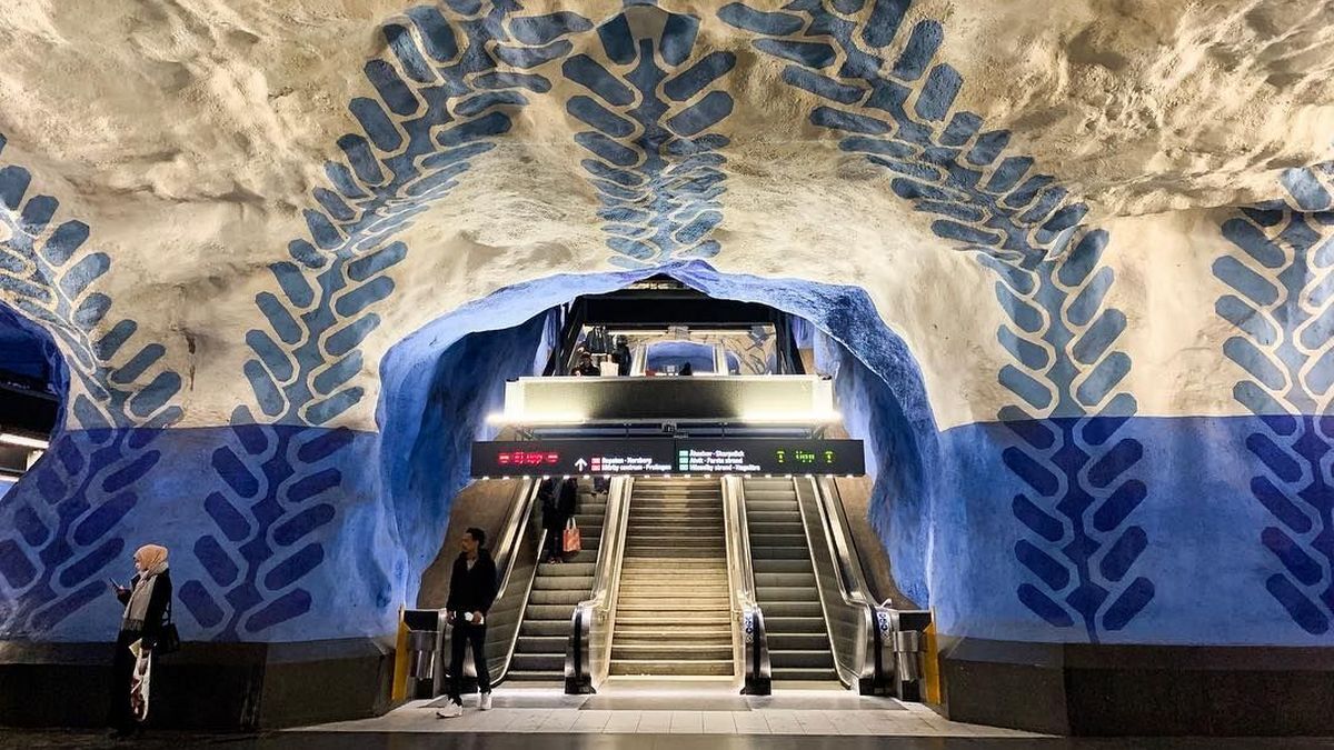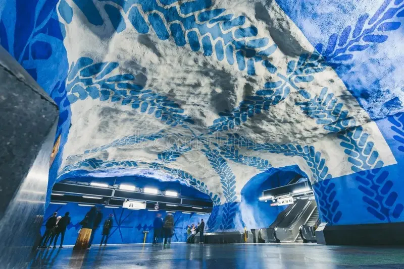 - T-Centralen (Стокгольм, Швеція). Знаменита своїми синіми розписами прямо на скелястих стінах. Відсутність класичного облицювання створює відчуття печери з мистецьким розписом. Саме завдяки таким станціям метро Стокгольма називають найдовшою художньою галереєю у світі.