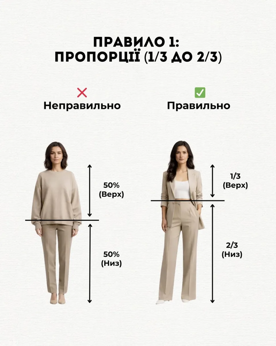 Суть методу полягає в тому, що фігура виглядає стрункішою і вищою, коли верхня частина образу займає приблизно третину зросту, а нижня – дві третини. Якщо ж одяг ділить тіло рівно навпіл, ноги здаються коротшими, а силует – приземленим. Саме тому високі посадки штанів, заправлений верх, коротші жакети або ремінь на талії працюють на візуальне подовження ніг і баланс фігури.