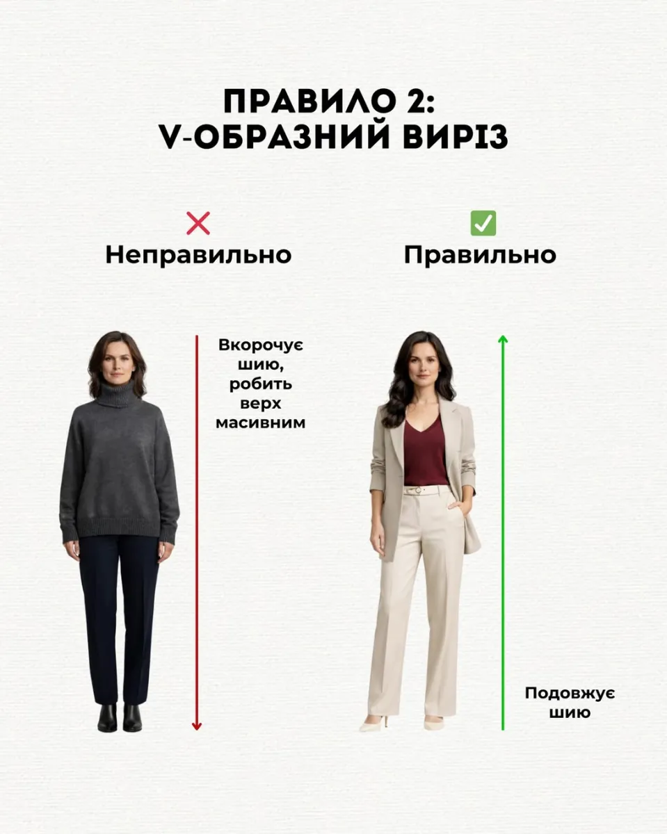 Ще одна порада від знаменитого модельєра – обирати V-образний виріз замість високого горла.