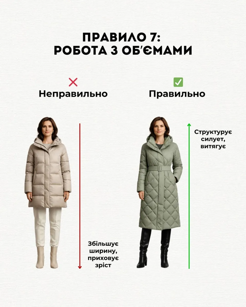 Важливо розрізняти безформний і структурований об’єм. Пухкі куртки без талії або надто мішкуваті пальта розширюють фігуру і «з’їдають» зріст. Натомість структуровані речі, особливо з поясом або чіткою лінією талії, формують силует і візуально витягують його.