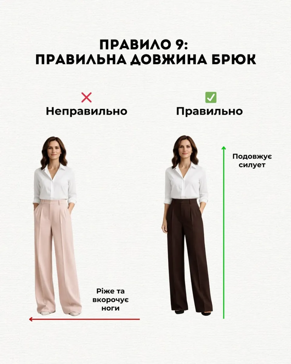 Саме вона часто вирішує, як виглядатиме образ загалом. Щоб візуально здаватися вищою, варто обирати моделі, які на кілька сантиметрів відступають від краю підбора. Занадто довгі штани можуть «різати» силует і вкорочувати ноги.