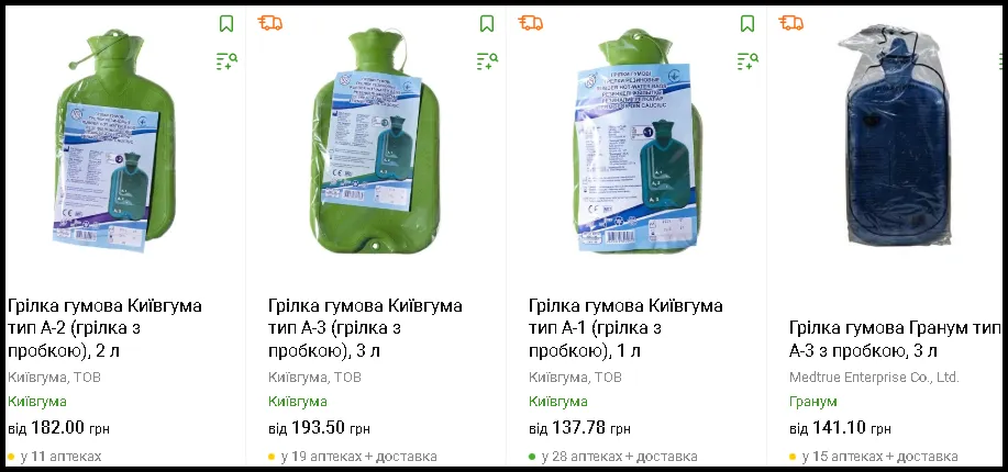 На онлайн-платформах ціни стартують від 130 грн за грілку об’ємом 1 л. Найпопулярніші – моделі «Київгума» типу А-1, А-2 та А-3. Комбіновані варіанти – дорожчі, від 209 грн.