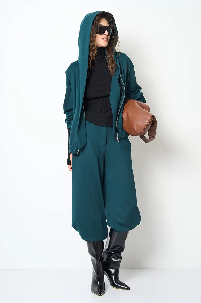 - Спортивний комфорт: Зелений бомбер у комбінації з чорними високими чоботами, вільними штанами та чорним гольфом. Дизайнер доповнив образ великими аксесуарами — сумкою та сонцезахисними окулярами, створивши комфортний, але стильний лук.
