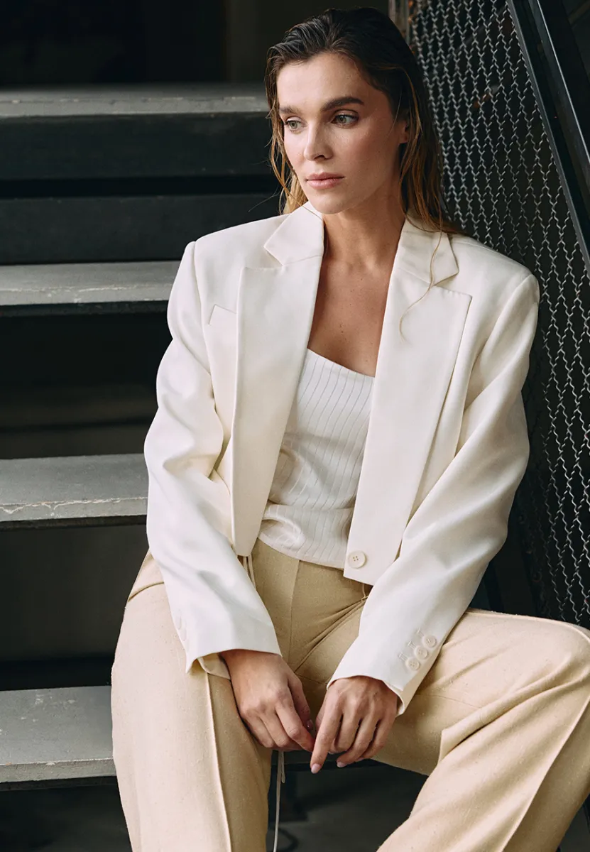 Жакет додає впевненості, а відкритий верх – жіночності. Разом це створює тонку сексуальність без зайвих пояснень.