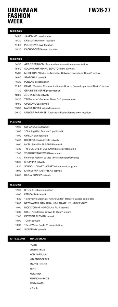 З 12 по 15 березня 2026 року в Києві відбудеться Ukrainian Fashion Week FW26-27. Про це стало відомо з офіційного сайту заходу.
