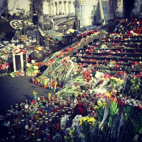 Квіти в памʼять Небесної Сотні в центрі столиці. Фото: Українська правда, фото від 25 лютого 2014 року