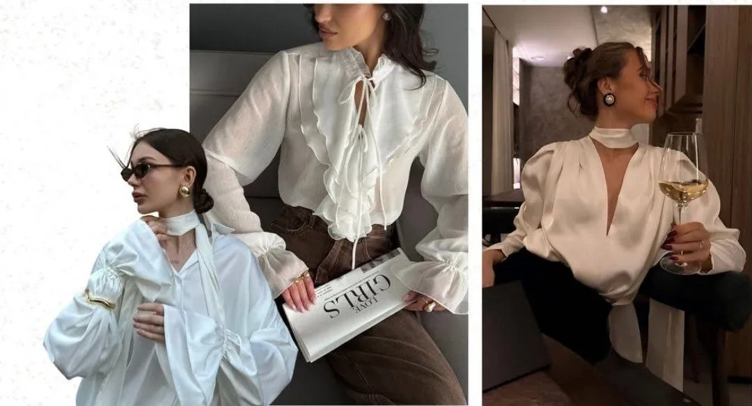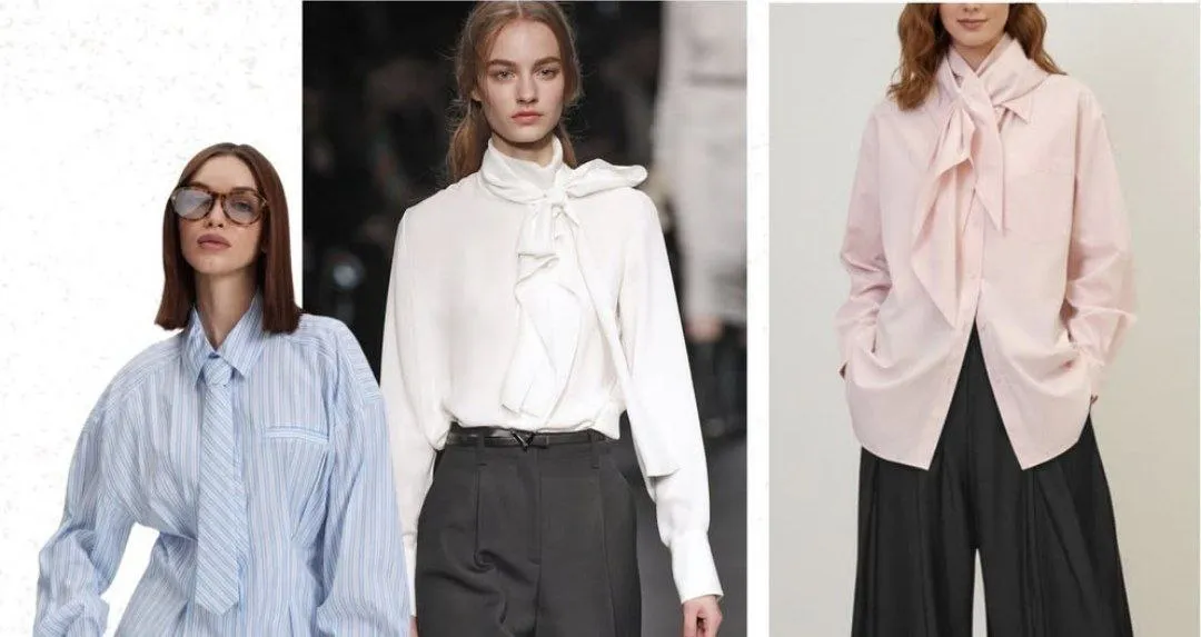 До класики з особливим шармом дизайнер відносить сорочки з косинкою або краваткою в тон. Ці моделі обіцяють стати фаворитами сезону, адже додають образу витонченості, хоча знайти ідеальний варіант може бути непросто.