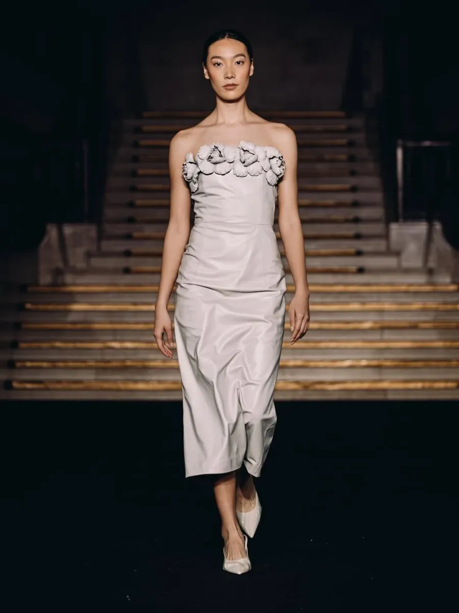 Дизайнерка Дар'я Плаксюк представила колекцію Art Nouveau. Chapter 1: Blooms — ніжну і водночас конструктивно складну роботу, в якій її захоплення архітектурою переплелося з поетикою природного пробудження. Скульптурні силуети сусідять із квітковою витонченістю епохи модерну, створюючи образи, що балансують між монументальністю і крихкістю.