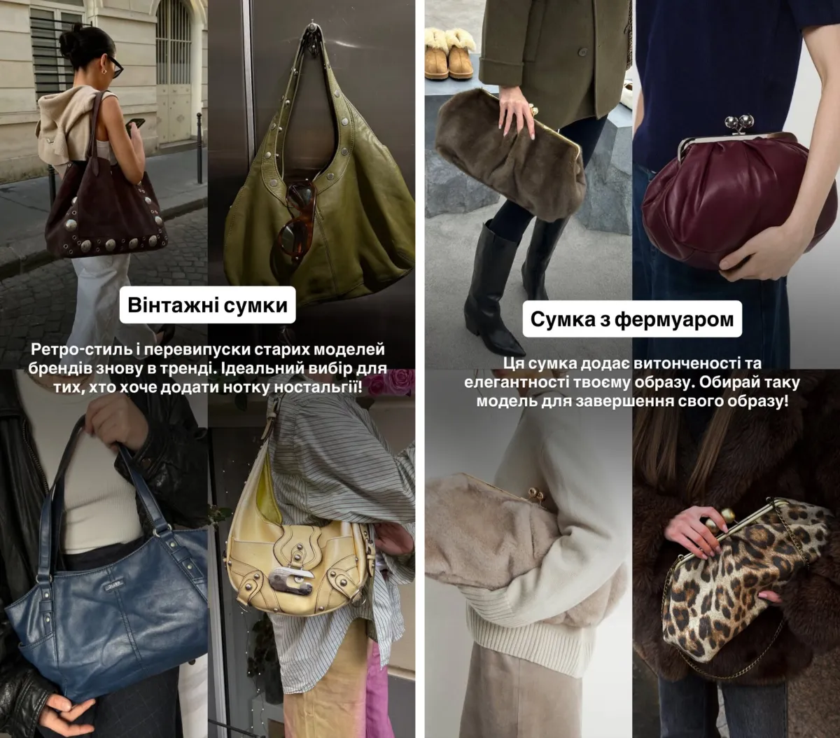 Повертається й вінтаж. Ретро‑моделі та перевипуски старих брендових сумок дизайнер називає «ностальгією, яка знову працює». А для тих, хто шукає вишуканості, Тан радить сумки з фермуаром — вони завершують образ і додають йому м’якості.