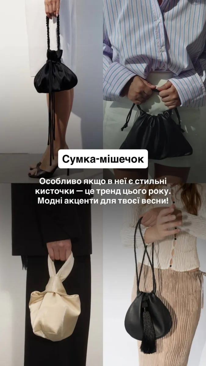 Серед фаворитів сезону – сумка‑мішечок. Тан наголошує, що моделі з декоративними кисточками додають образу руху та легкості – саме того настрою, який асоціюється з весною.