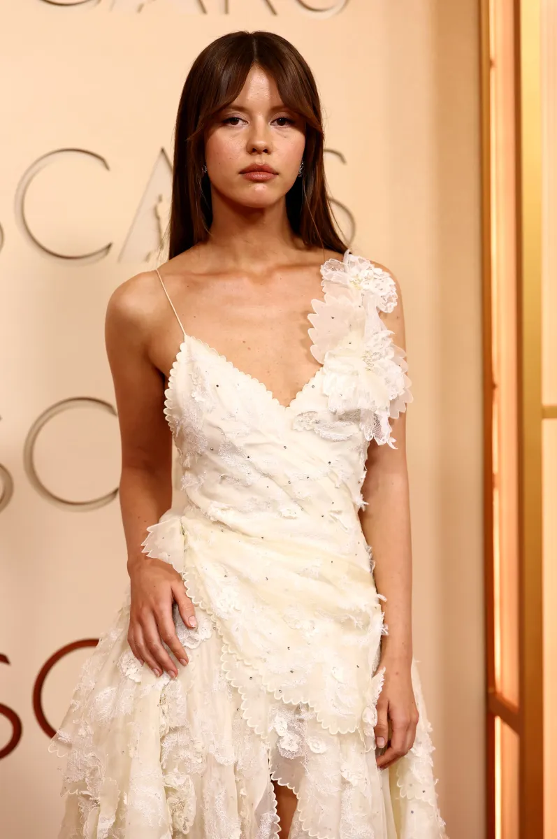 Мія Ґот обрала темніший теплий нюд із коричневим підтоном. Він ідеально гармонував із сяйливою шкірою та стриманим акцентом на очах, підкреслюючи сучасну чуттєву елегантність.