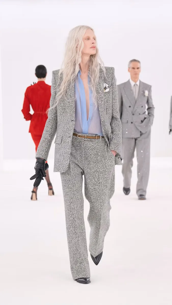 Серед інших, від бренду Tom Ford вийшла на показ модель Крістен Макменамі, якій наразі 61 рік. Вона з'явилася у стильному піджаку і має виразне волосся блондинки.