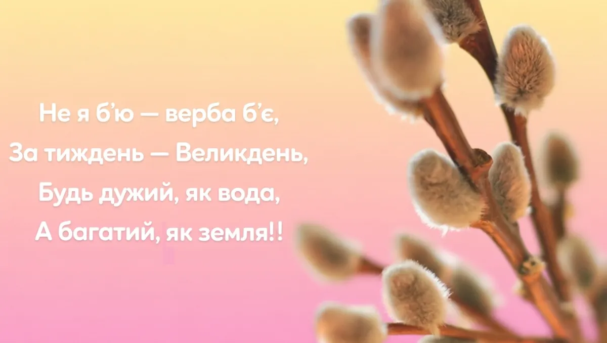 «Нехай вербові котики принесуть у твій дім мир та весняне оновлення. Не я б’ю – верба б’є, за тиждень – Великдень!».