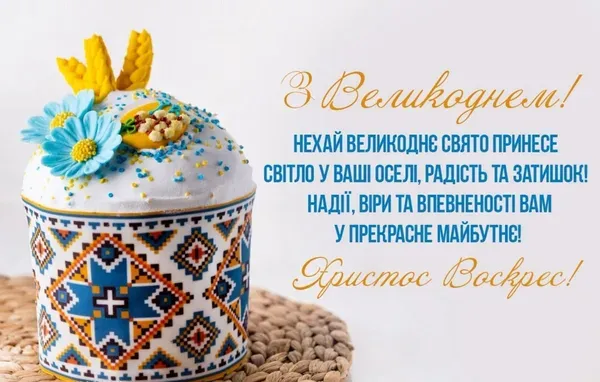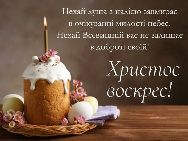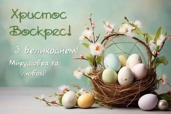 Христос Воскрес! Вітаю зі світлим Великоднем! Нехай у твоєму домі панують мир і злагода, а Божа благодать огортає кожен день. Хай серце буде сповнене спокоєм, думки – чистими, а святковий стіл – щедрим. Радісних свят і смачної паски!