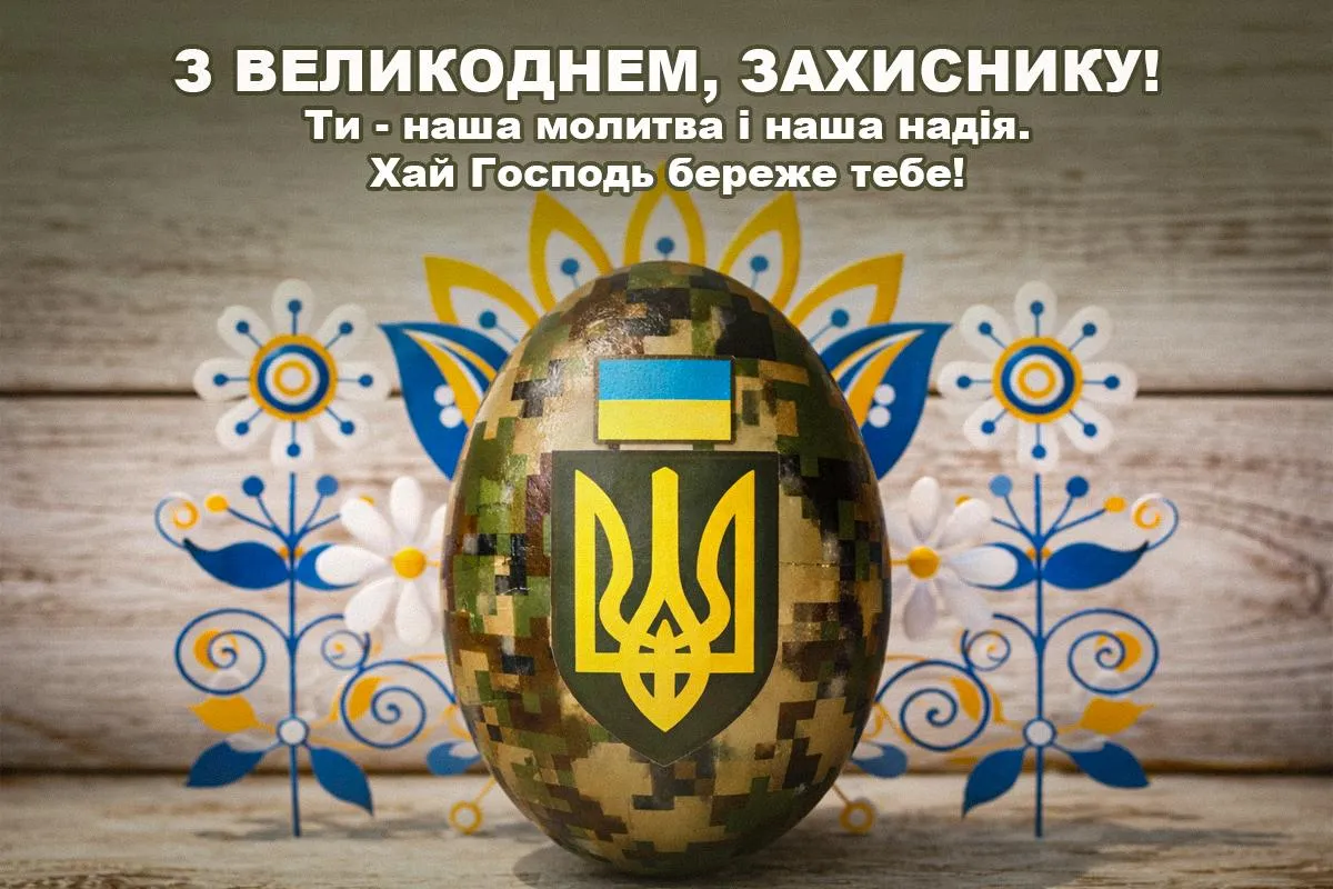 Разом із привітаннями українці традиційно надсилають листівки – від стриманих патріотичних до яскравих святкових. На них – символи Великодня, поєднані з військовою тематикою: тризуби, жовто‑блакитні крашанки, світлі побажання миру та перемоги.
