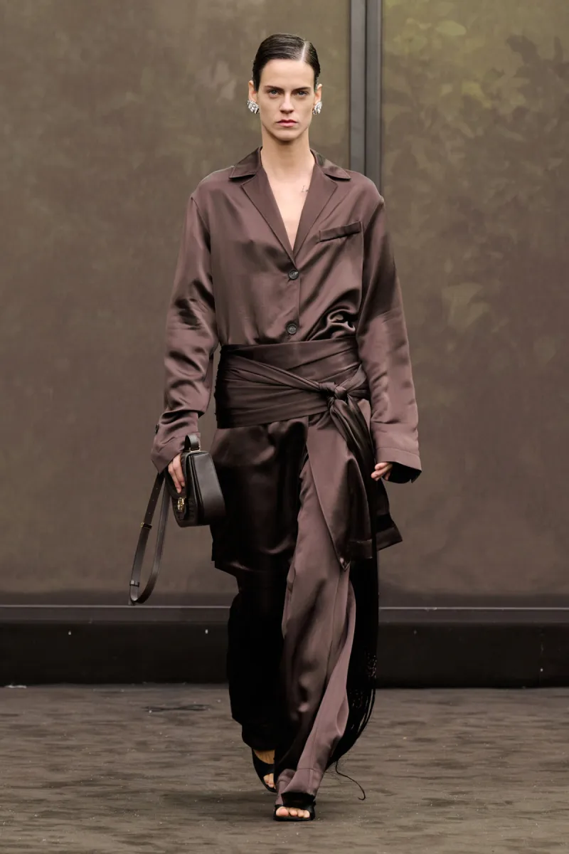 Третій варіант – найгнучкіший. Брюки з защипами помірного об'єму створюють стриманий і елегантний образ. Штани-аладіни або barrel legs додають аутфіту легкості, а шовковий пояс-кушак поверх комплекту додає акценту. Хто тяжіє до вільної богемної естетики, можуть надихнутися максимально широкими силуетами з колекцій Boss і Sa Su Phi.