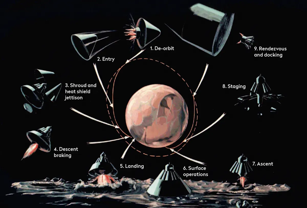 Архівні ілюстрації з презентації Вернера фон Брауна про пілотовану посадку на Марсі.