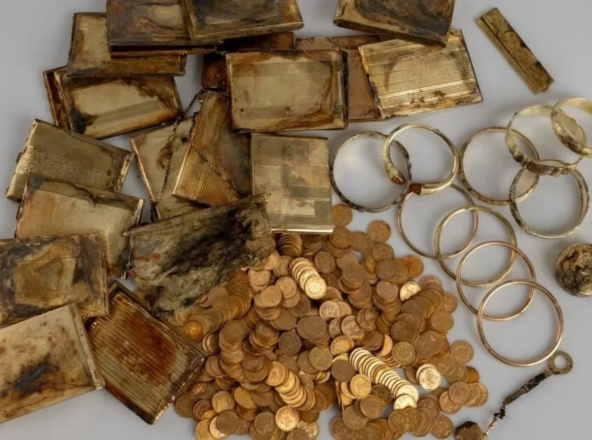 У першій схованці туристи виявили 598 золотих монет, складених у кілька стопок і загорнутих у тканину. Неподалік, приблизно за метр, знаходився ще один тайник - залізна скринька з коштовностями. У ній були портсигари, браслети, гаманець, пудрениця та інші предмети з дорогоцінних металів.