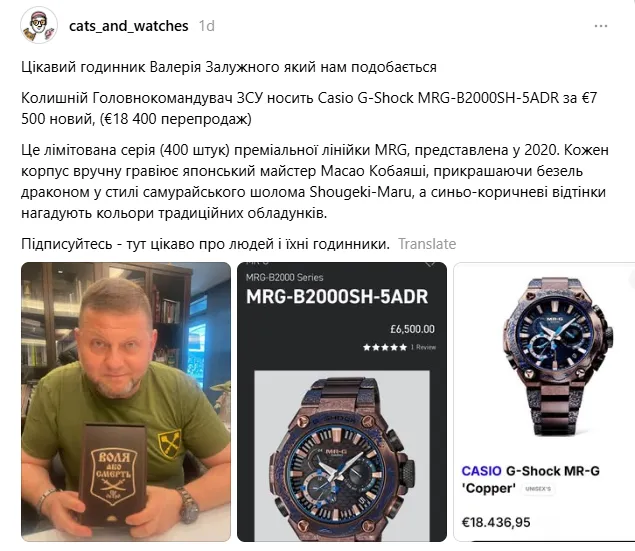 «Колишній Головнокомандувач ЗСУ носить Casio G-Shock MRG-B2000SH-5ADR за €7 500 новий, (€18 400 перепродаж). Це лімітована серія (400 штук) преміальної лінійки MRG, представлена у 2020. Кожен корпус вручну гравіює японський майстер Масaо Кобаяші, прикрашаючи безель драконом у стилі самурайського шолома Shougeki-Maru, а синьо-коричневі відтінки нагадують кольори традиційних обладунків», – пише cats_and_watches.