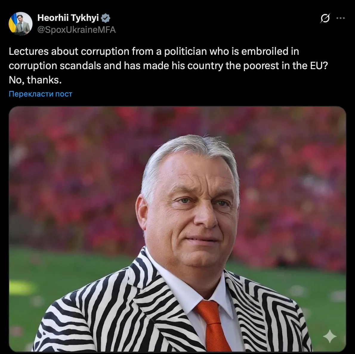До свого допису український речник додав зображення Орбана, якого ШІ одягнув в піджак кольору зебри, з натяком на нещодавній скандал в Угорщині, пов’язаний із дачею Орбана, на території якої журналісти виявили приватний зоопарк із зебрами та іншими екзотичними тваринами.