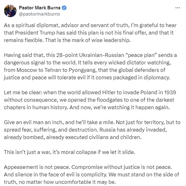 Марк Бернс, який відповідає за духовні питання та дипломатію в команді Дональда Трампа, висловив серйозну стурбованість. Його занепокоїла запропонована угода з 28 пунктів щодо примирення України та Росії. На думку дипломата, навіть натяки на гнучкість у цьому питанні несуть загрозу для всього світового порядку.