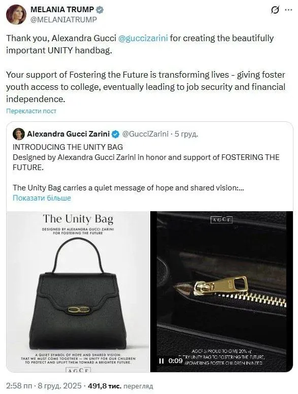Як відомо, ексклюзивна сумка Unity Bag, яку прорекламувала Меланія, була створена на підтримку її ініціативи Fostering the Future. Перша леді навіть зробила репост дизайнерки Гуччі Заріні, правнучки засновника бренду Gucci, яка презентувала сумку.