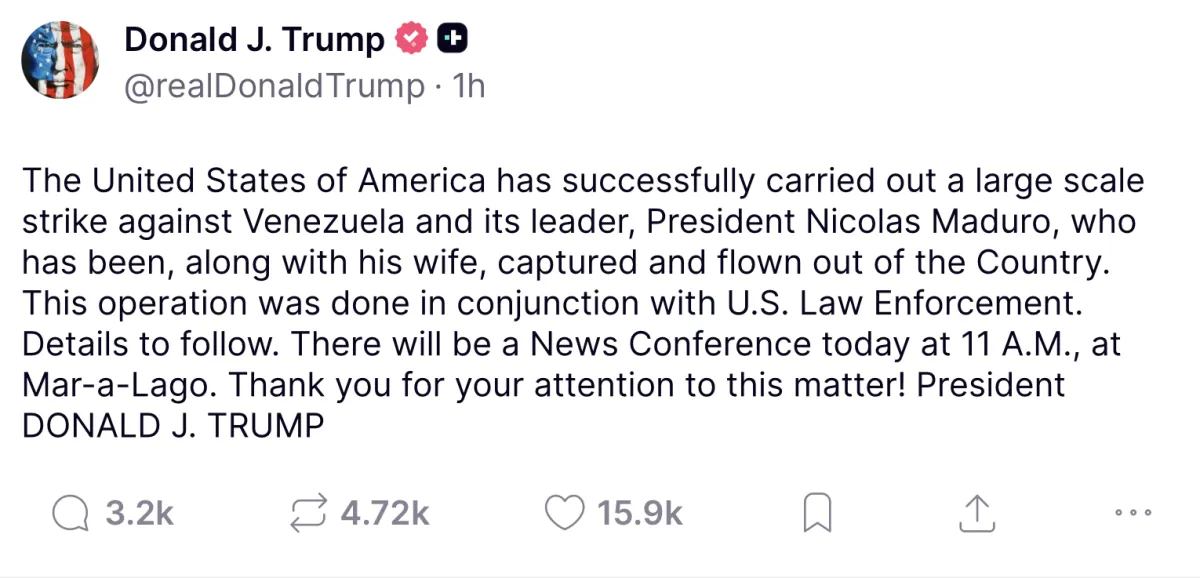 Дональд Трамп оголосив про проведення масштабної військової операції у Венесуелі, внаслідок якої Ніколаса Мадуро разом із дружиною було захоплено та евакуювано з країни.