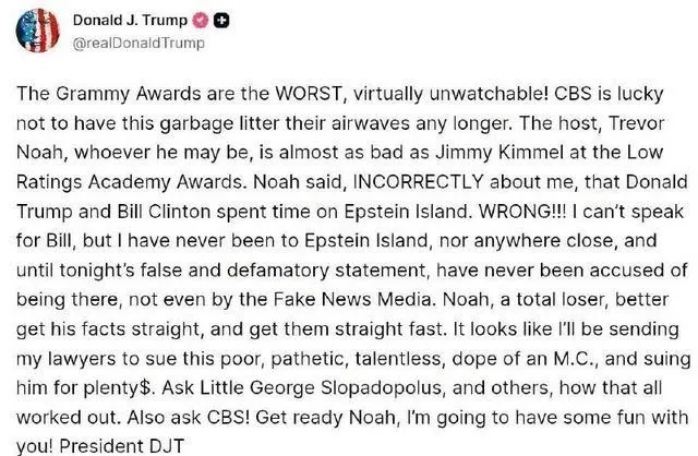 Трамп не забарився з відповіддю. Він назвав «Греммі» найгіршим шоу, яке, за його словами, «практично неможливо дивитися». Жарт Ноа президент США охрестив відвертим наклепом і заявив, що ніколи не був на острові Епштейна.