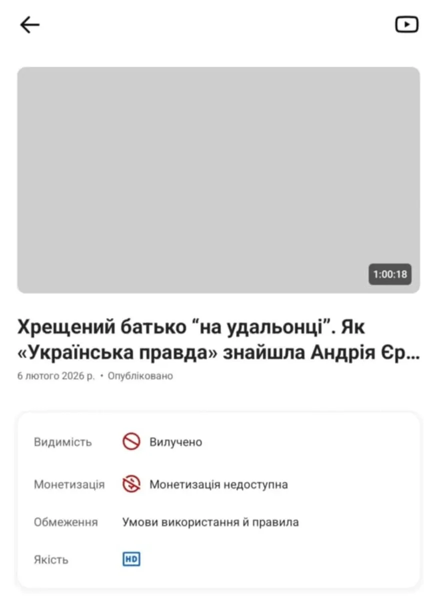 YouTube видалив відео про Андрія Єрмака. Скріншот УП