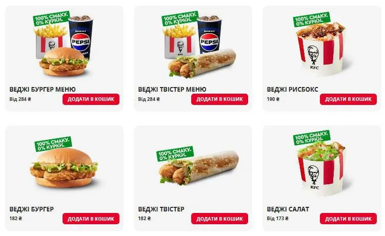 Як свідчить пресслужба Kentucky Fried Chicken, вартість страв для тих, хто не вживає м'яса, виглядає наступним чином: