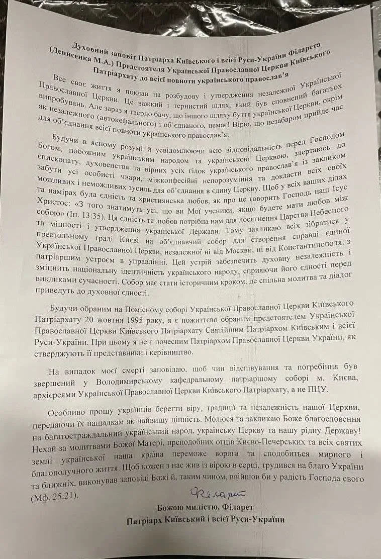❗️У своєму заповіті Філарет наголошує, що присвятив своє життя розбудові незалежної Української православної церкви та вірить у повне об’єднання православ’я на теренах нашої держави.