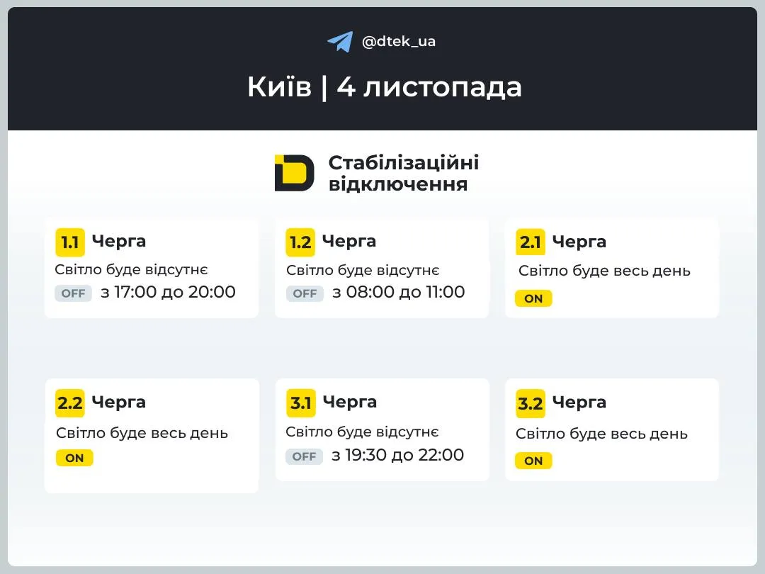 Як інформує пресслужба ДТЕК, у Київській та Дніпропетровській області, а також у Києві, завтра, 4 листопада, світло відключати планують наступним чином, у визначені часові проміжки.