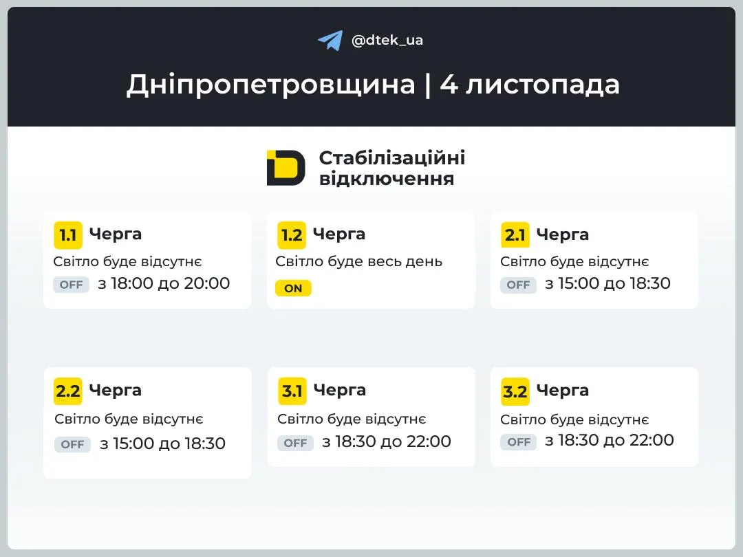 Графік відключень у Дніпропетровській області 4 листопада. Джерело: ДТЕК