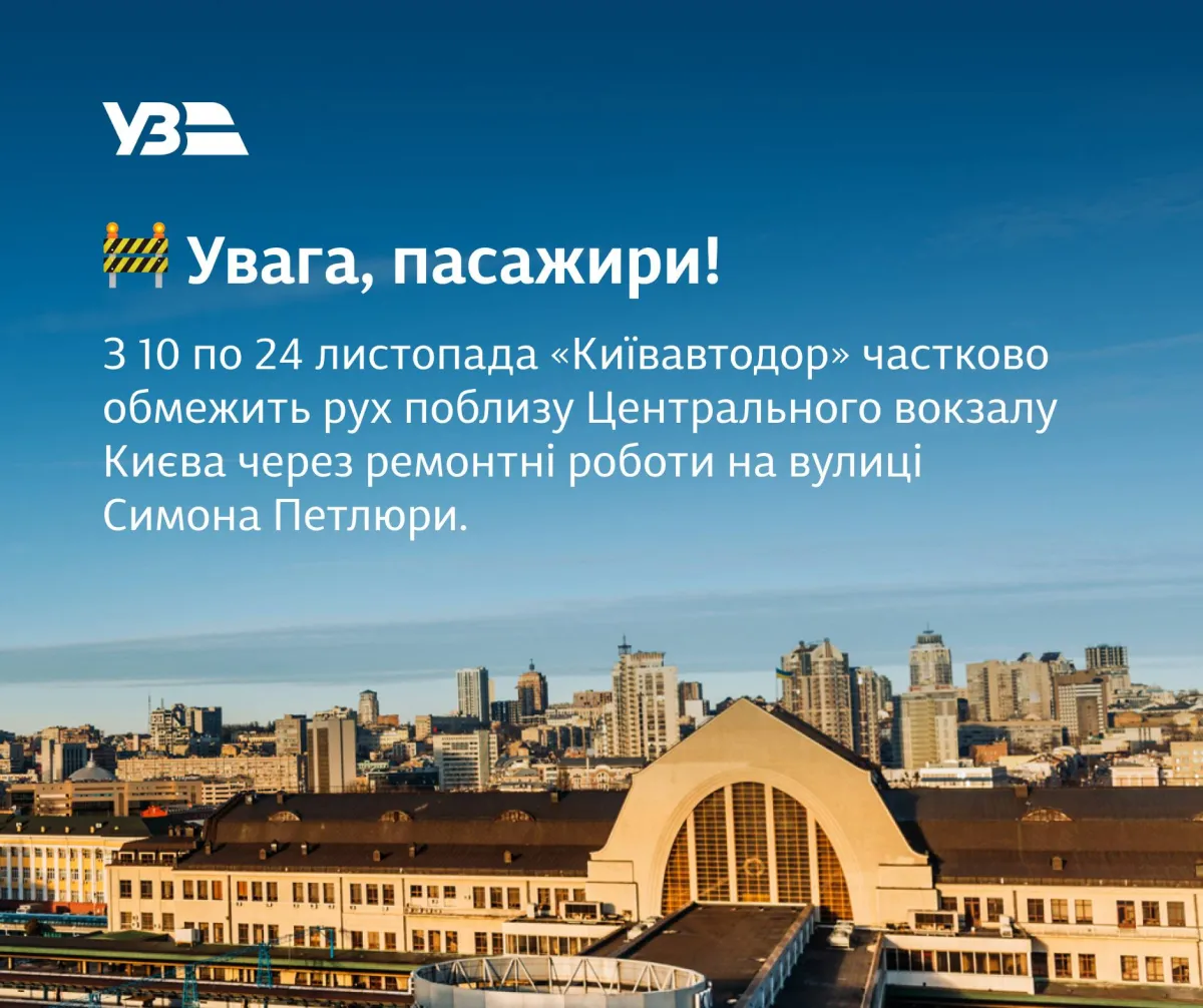Укрзалізниця повідомляє, що з 10 по 24 листопада компанія «Київавтодор» частково обмежить рух транспорту поблизу Центрального залізничного вокзалу Києва.