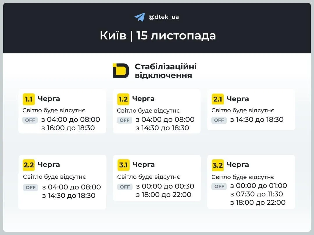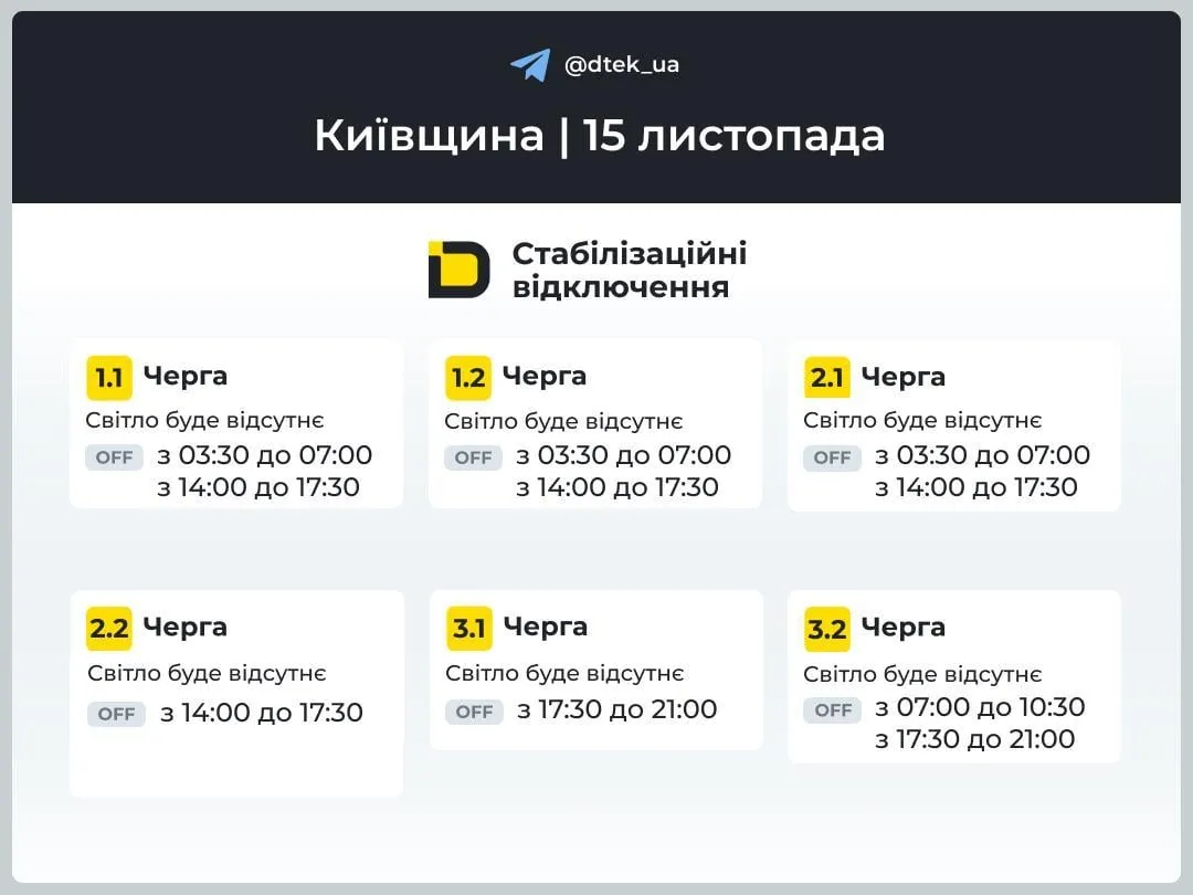 Всі 6 черг на Київщини 15 листопада також будуть отримувати електроенергію дозовано: