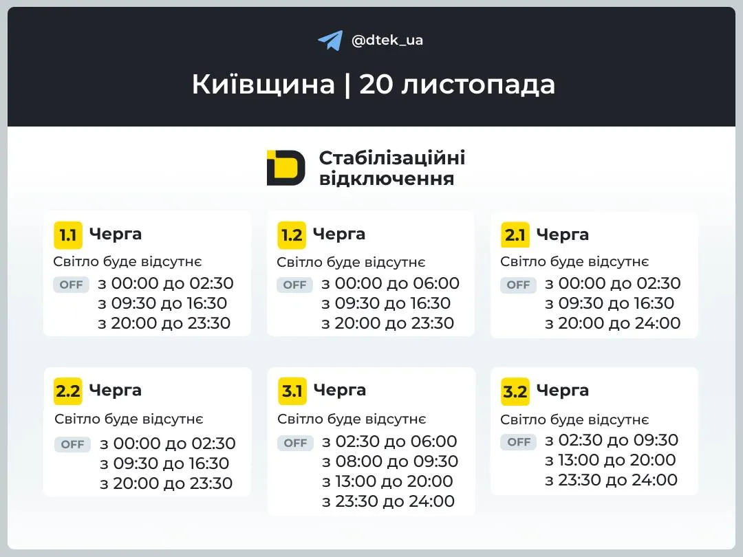 Графіки відключення світла 20 листопада: українцям слід готуватися до тривалих блекаутів