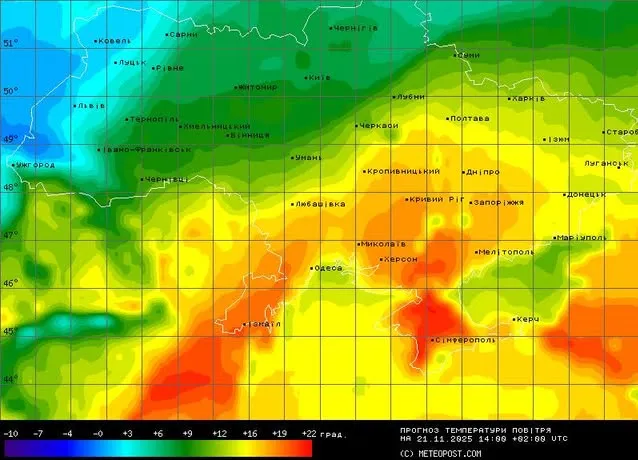 «У прогнозі на завтра, 21 листопада, одразу повідомляю, що очікується потепління! Карта прогностична - нижче, градація температури також там є, внизу. Звісно, що не повсюди. Але хотіла б поінформувати, що у прогнозі переважаючою є інформація про більшість території і ображатися не варто, якщо часом ваша локація сюди не ввійшла».