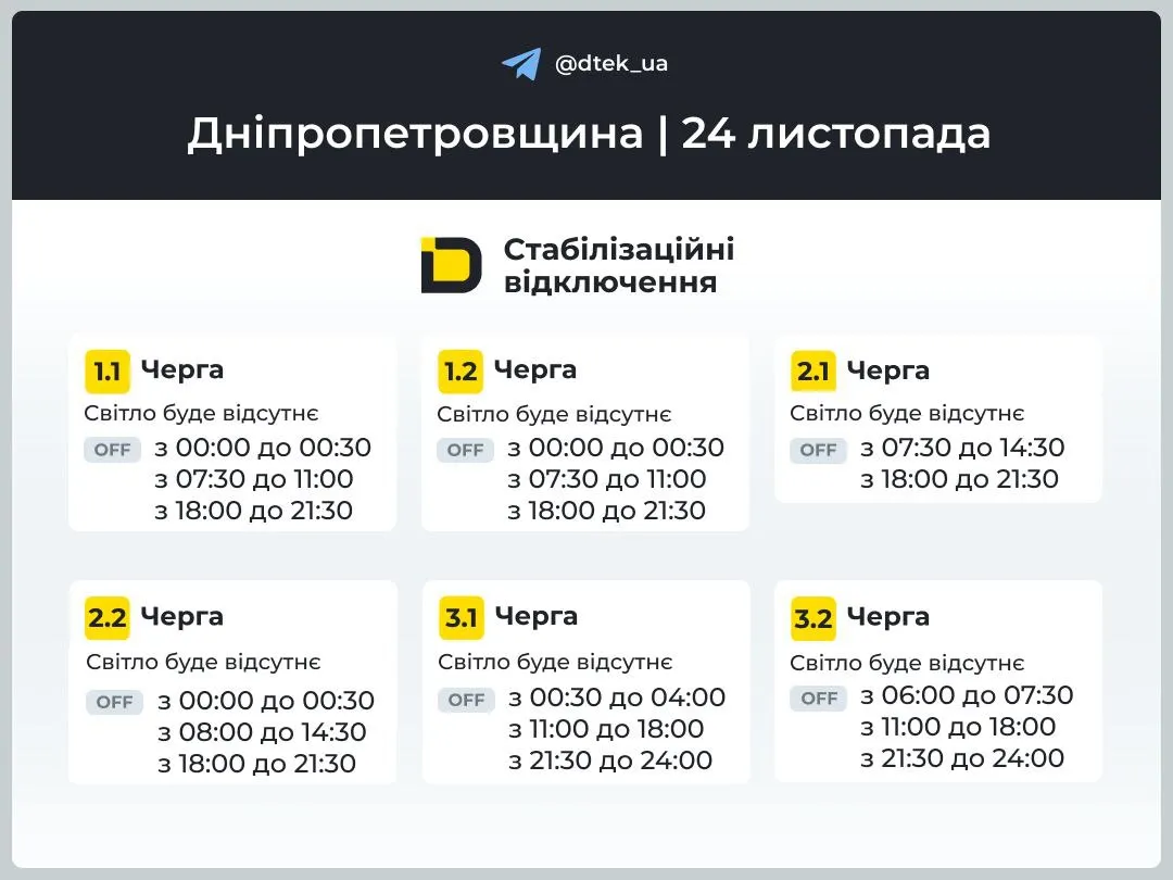 - 04 Графіки відключення світла у Дніпропетровській області 24 листопада