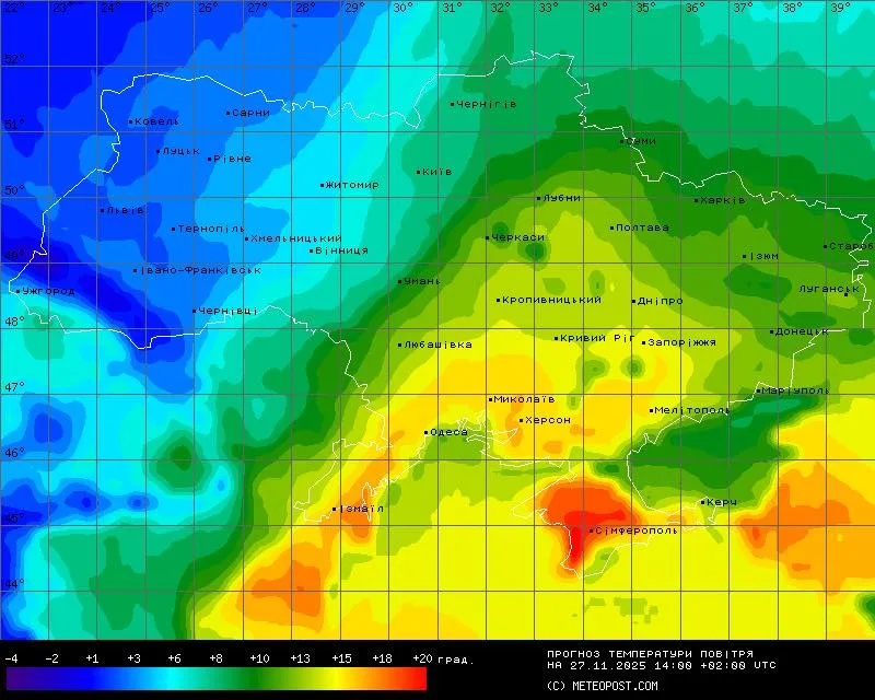 «Карта прогнозу температури повітря на завтра, 27-го листопада, та, що внизу, каже нам: найхолодніше буде в четвер у західних областях, вдень лише +2+6 градусів, а найтепліше у південній частині, +12+16, в Криму аж до +15+20 градусів!».