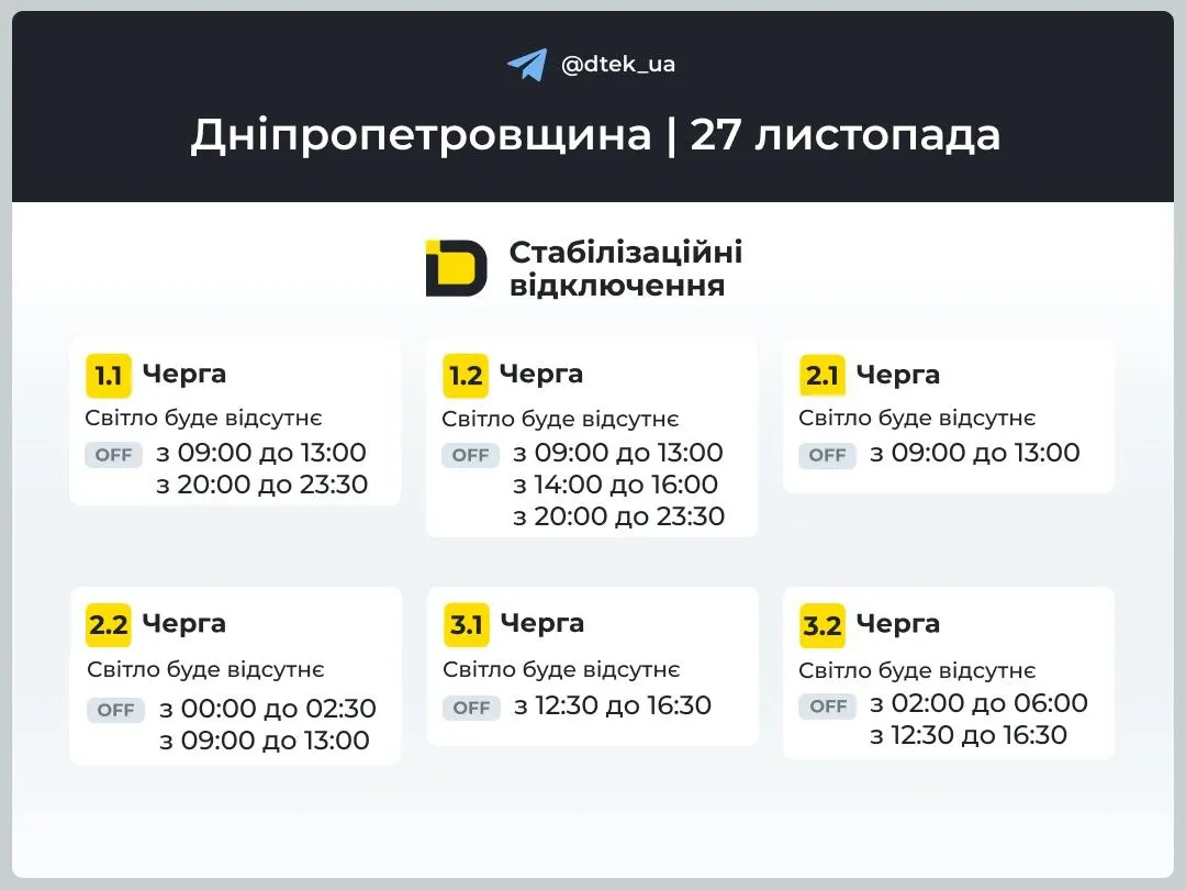 ДТЕК оприлюднив розклад відключень для Дніпропетровщини на 27 листопада - світло вимикатимуть у всіх чергах протягом доби.