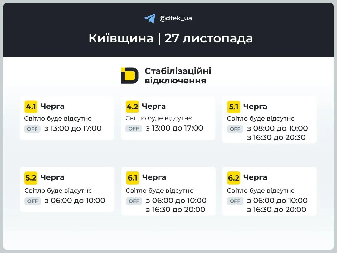 - 03 Графіки відключення світла на Київщині 27 листопада