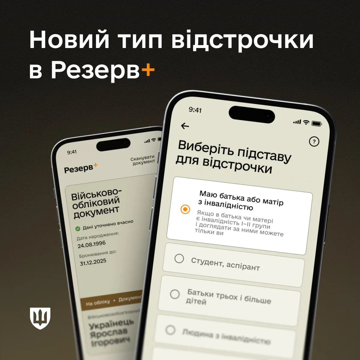 Застосунок Резерв+ вже пропонує 11 типів онлайн-відстрочок, зокрема для людей з інвалідністю, батьків дітей з інвалідністю, тих, хто має дружину чи чоловіка з інвалідністю, студентів та інших категорій.