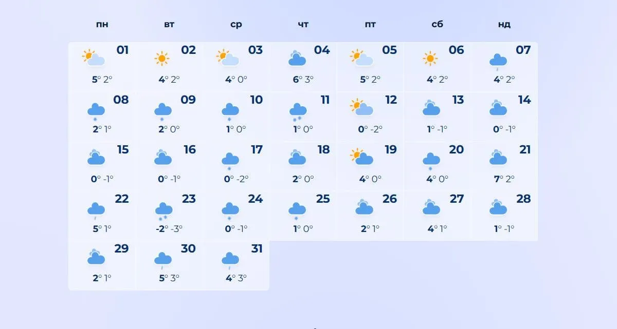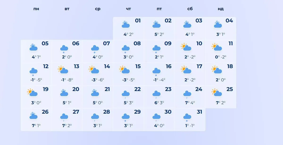 Снігопади прогнозуються лише кілька разів: 6–9, 12, 16 та 29 січня. У другій половині місяця часті дощі. Температура коливатиметься, з нічними заморозками, але без сильних холодів.