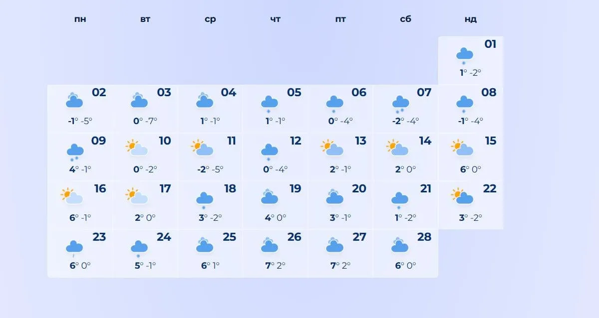 Стане прохолоднішим, але все одно теплішим за норму. Збільшиться кількість сонячних днів. Майже половина місяця пройде з опадами. Завершиться сезон потеплінням до +7°.